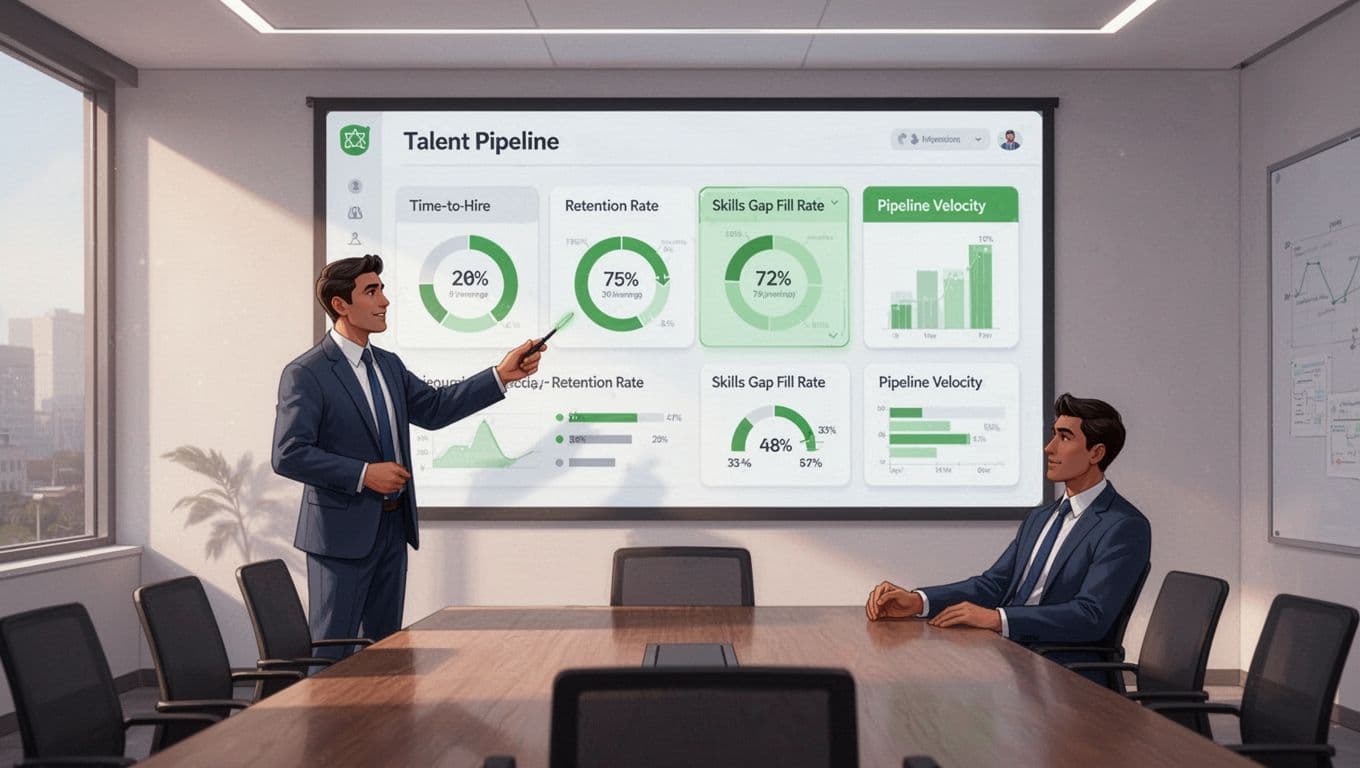 Modern illustration of a cybersecurity leader in a conference room pointing at a large screen displaying a KPI dashboard for talent pipeline metrics including time-to-hire, retention rate, skills gap fill rate, and pipeline velocity.