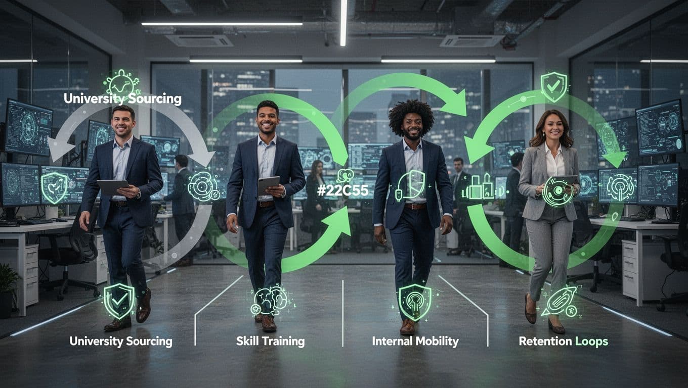 Modern illustration in clean shapes showing a flowchart of the cybersecurity talent pipeline from sourcing universities and fields, skills training, internal mobility, to retention loops, with diverse professionals in a high-tech office connected by accented arrows.