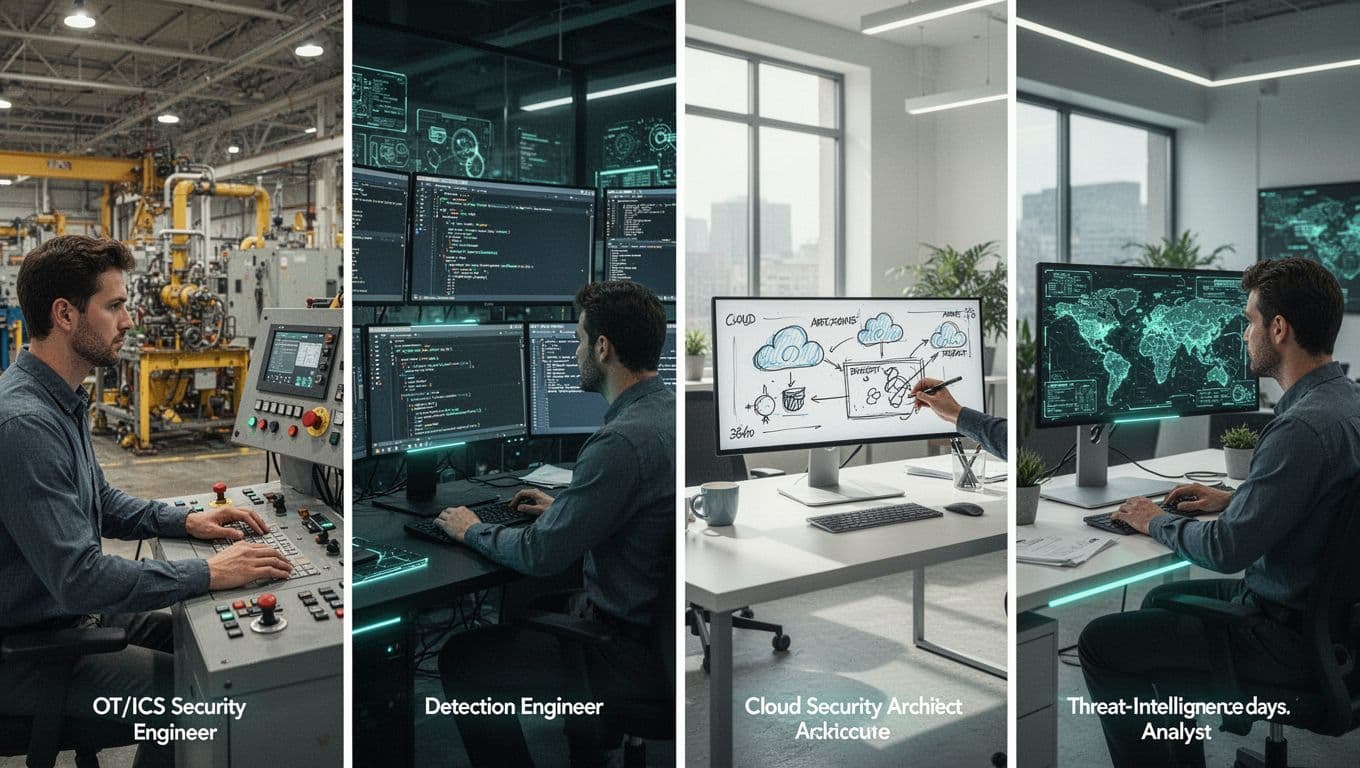Modern illustration depicting four cybersecurity specialists in rare roles: OT/ICS security engineer in a factory, detection engineer in a SOC, cloud security architect in an office, and threat intelligence analyst reviewing maps, arranged in a landscape grid of vignettes.